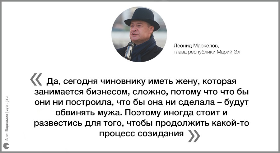 Существует ещё прекрасное антикоррупционное расследование: из него нам известно, что развод Маркелова позволил ему скрыть причастность к компаниям, совокупный годовой доход которых превышает 2 млрд 260 млн рублей. Большая часть компаний принадлежала жене главы Марий Эл Ирине Маркеловой, но в 2012-2013 годах многие из них перешли во владение другой родственницы губернатора -- Татьяны Ивановны Маркеловой.