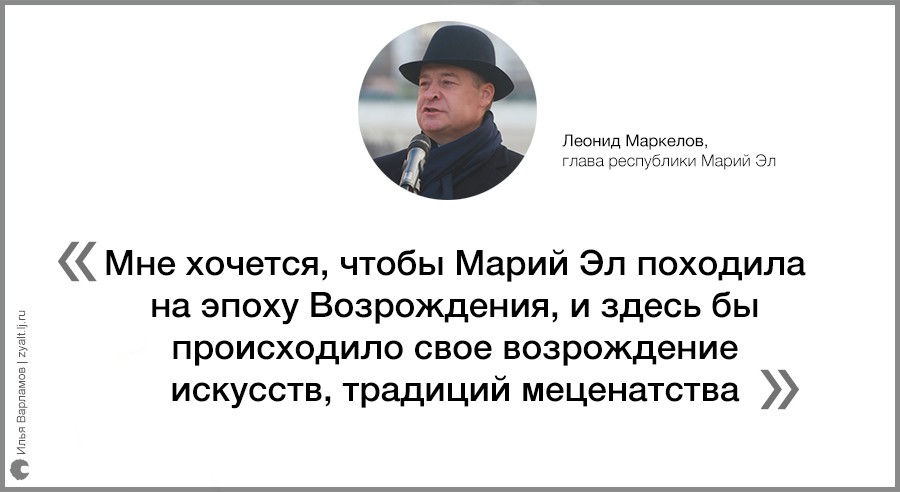 Сам себя Маркелов, возможно, ассоциирует с Лоренцо Медичи, или Лоренцо Великолепным. "Мне хочется, чтобы Марий Эл походила на эпоху Возрождения, и здесь бы происходило свое возрождение искусств, традиций меценатства", -- сказал глава республики, открывая в 2012 году очередной памятник. По данным "Дождя", меценатом, который дал денег на памятник Медичи, стал именно Маркелов.